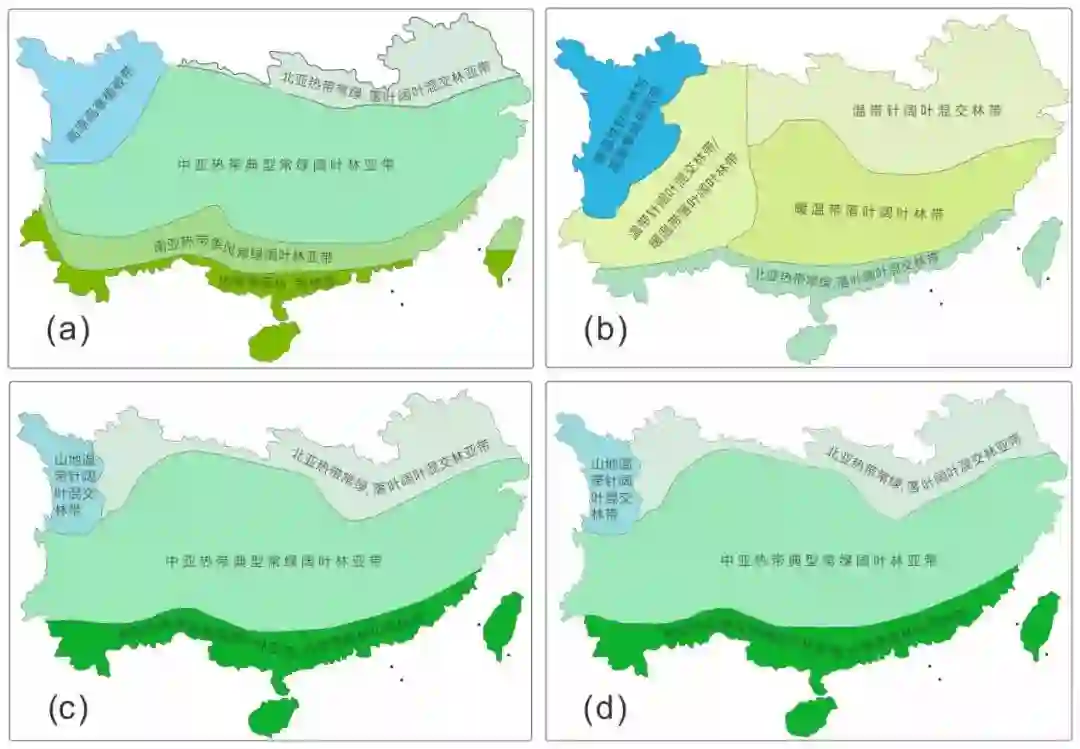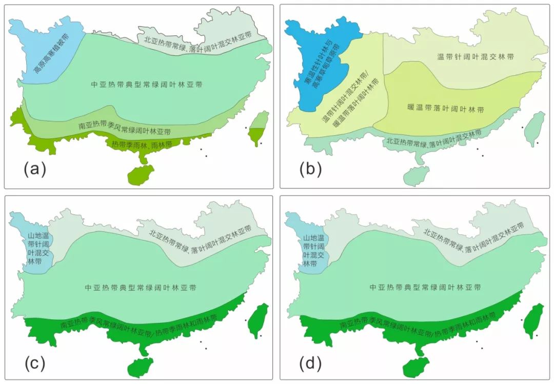 中国南方植被分带图(a)现代植被分带图;(b)18ka BP植被分带图;(c)9ka BP植被分带图;(d)6ka BP植被分带图