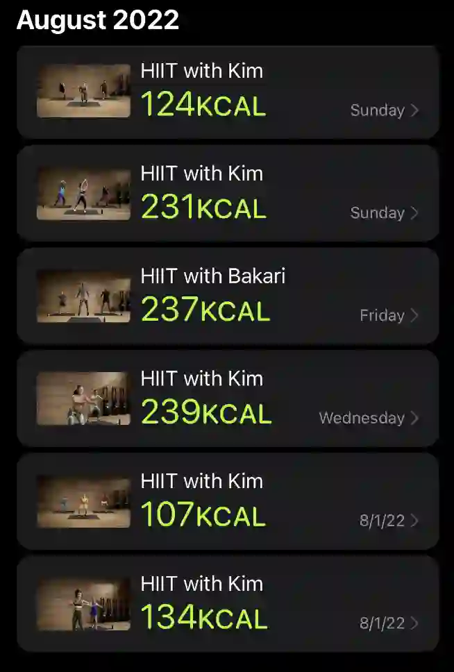除此之外,我还会间歇性断食,午餐和晚餐安排在六小时内,除了这两餐外我尽量不摄入任何带有热量的食物,饮料方面也只喝白水、咖啡、气泡水、鲜榨柠檬汁等低热量或无热量的饮料。由于我对代糖依然持谨慎态度,我只偶尔摄入代糖产品。在关节疼痛基本恢复的时候,我也顺带恢复了 HIIT 日程,隔一天跟着 Fitness+ 上的教练(Hey Kim)跳段 HIIT。
