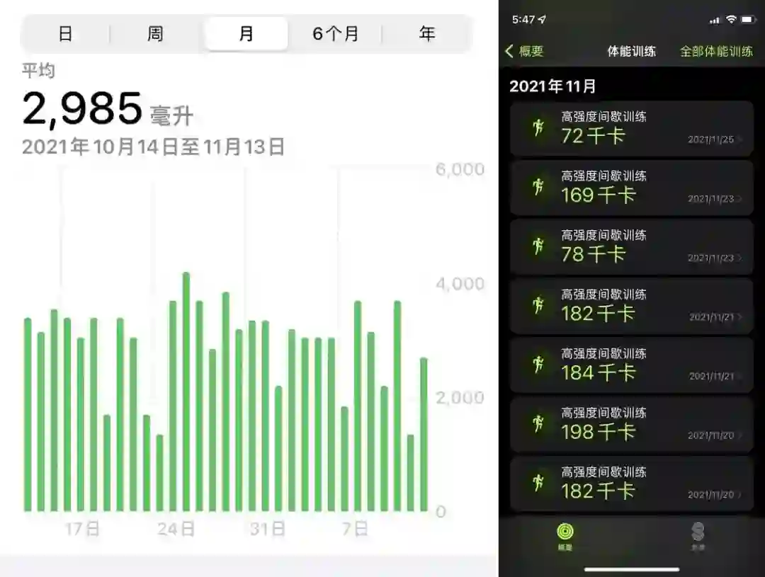 与南南十分类似,喝水+运动仿佛是解决所有健康问题的第一步。多喝水我使用了 WaterMinder(现在已换到 HiWater),那段时间保持了 3L 左右的饮水量,并作为一个习惯保持到今天(但因为 3L 实在太多缩减到了 2.5L)。运动选择了 Apple Fitness+,恰好那段时间刚买了 Apple Watch,随新表附送了三个月订阅。虽然说没法做到每天都自律的 HIIT,但还是基本保证了隔一天一次的强度。