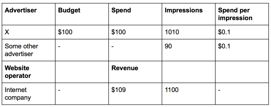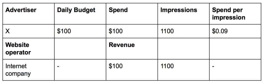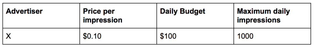 我们举个例子来详细说明一下。假设有一个能提供广告投放的互联网公司,广告主 X 向该公司购买了出价为 $0.10 元 / 曝光 、预算为 $100 元 / 天的广告服务。这意味着该广告每天最多曝光 1000 次。