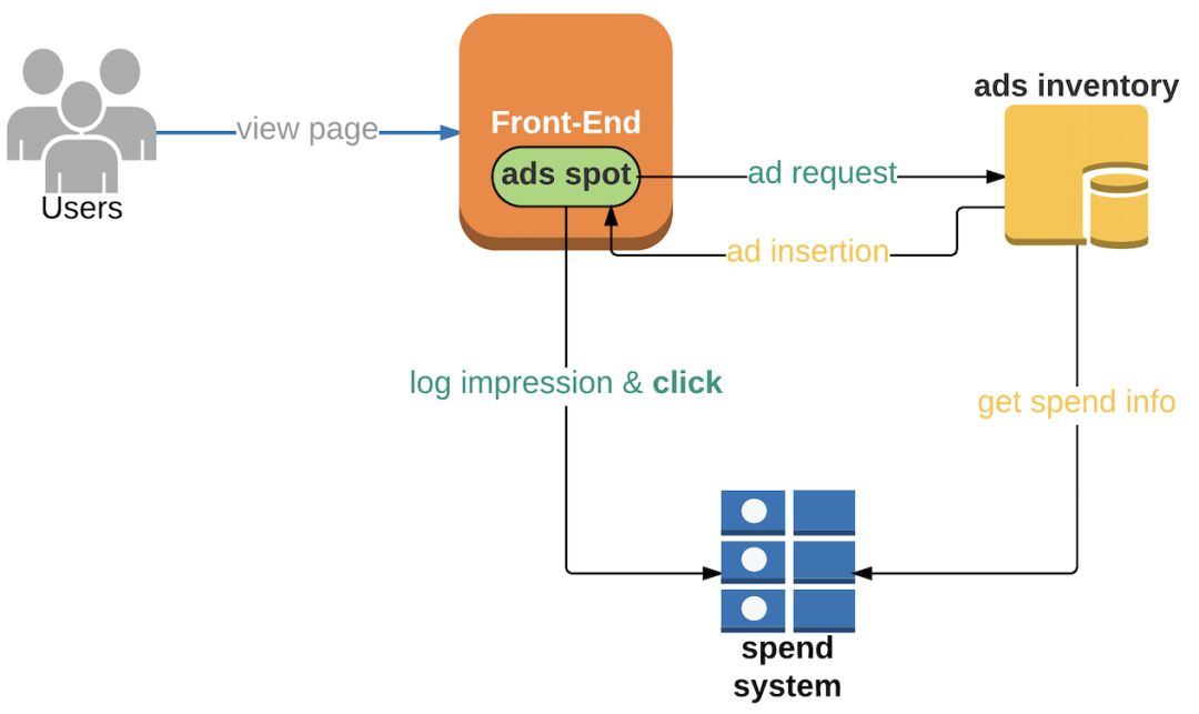 当网站上出现新的广告展现机会时,前端会向广告库(ad inventory)请求一条广告。广告库根据广告主 X 的剩余预算来决定是否投放他们的广告。如果预算仍然充足,广告库将通知前端进行一次广告投放(比如在用户端 APP 的一个广告位上展示出来)。当用户浏览了该广告后,一个曝光事件会发往计费系统。