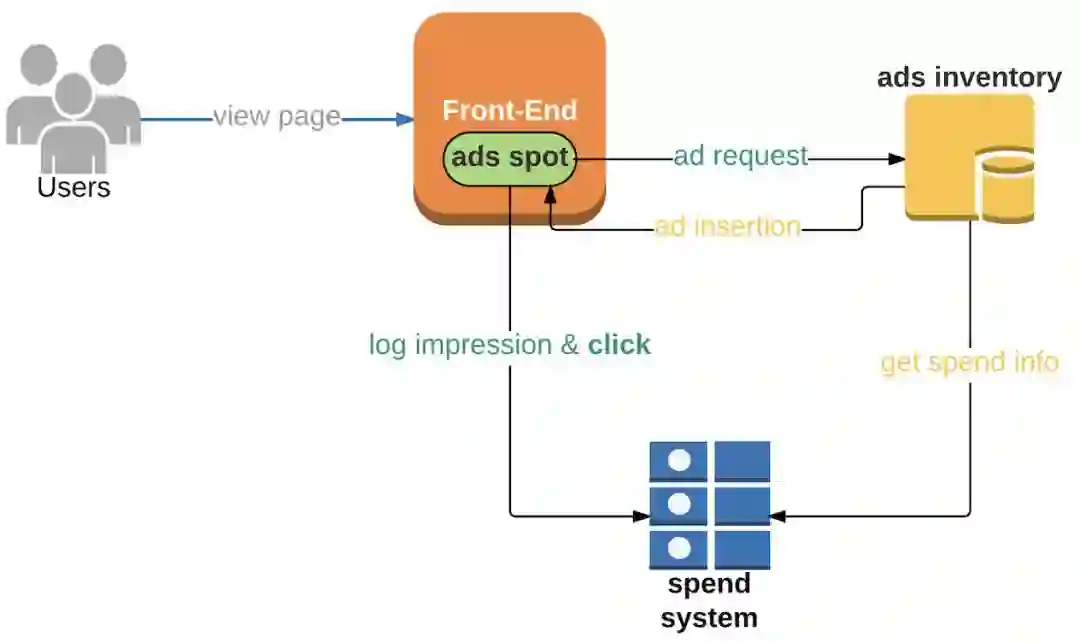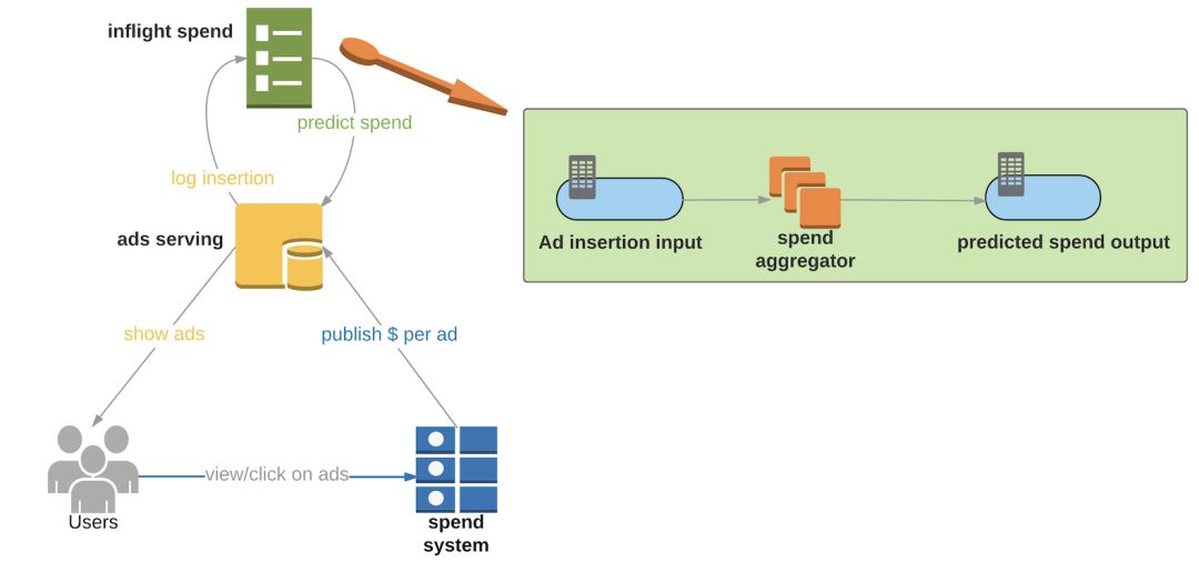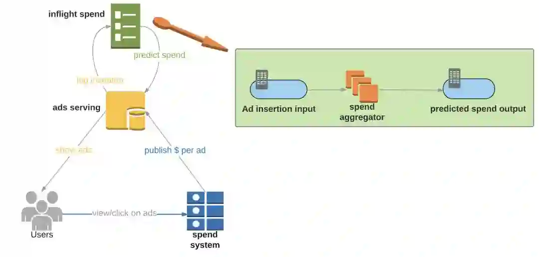 广告投放系统(Ads serving):负责分发广告到用户端、记录广告投放、并从消耗预测服务("inflight spend" service)中获取预测消耗数据。