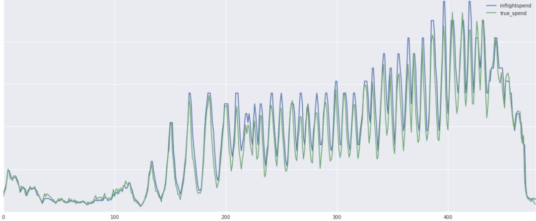 在实际应用中,我们的消耗预测的准确率非常高。在整个预算预测系统上线之后,我们的超投率明显下降了。下图是我们的实际消耗与预测消耗的一个对比测试结果样例。