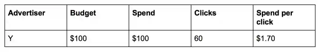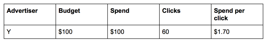 不久之后,另一位广告主 Y 也联系了这家公司,并希望以 $100 元 / 天的预算、$2.0 元 / 点击(例如,一个用户通过点击广告链接到达广告主 Y 自己的网站)、最多每天 50 次点击的价格购买广告。这家公司把广告主 Y 加到他们的广告投放流程里,并在他们的系统增加了点击事件的跟踪。