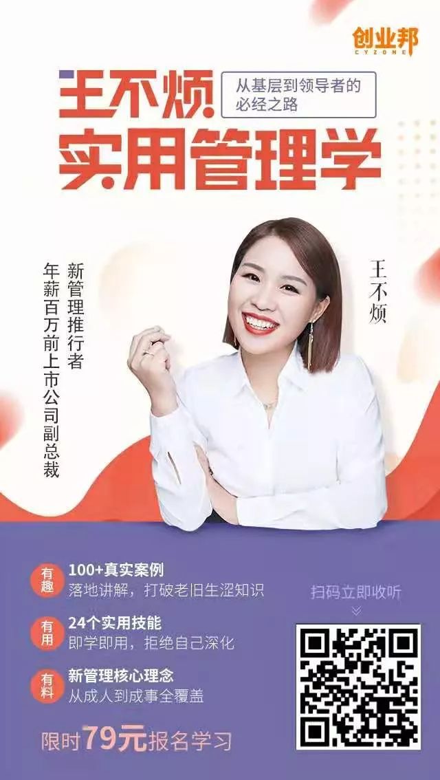 创业邦联合王不烦老师精心制作了这门实用、落地的管理课,让你快速掌握、直接用到工作中,目前双十一活动价仅需79元。