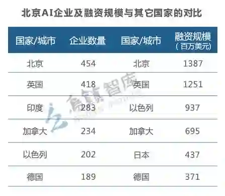 通过对比更具体的数据,我们可以看到,北京一城市的新增企业已高于印度,在企业发展势头上,中国的人工智能产业具有更显著的竞争力。