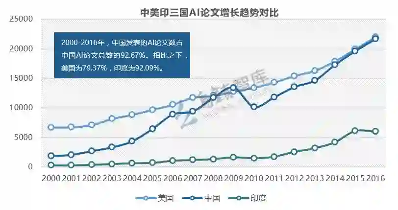 截至2017年,中国发表超过16万篇人工智能论文,其中机器学习超过1.1万篇,计算机视觉方面超过1万篇,机器人1.3万多篇,自然语言处理6千多篇;印度人工智能领域论文数超过3万篇,机器学习论文近3千篇,计算机视觉超过4千篇,机器人2千多篇,自然语言处理2千多篇。