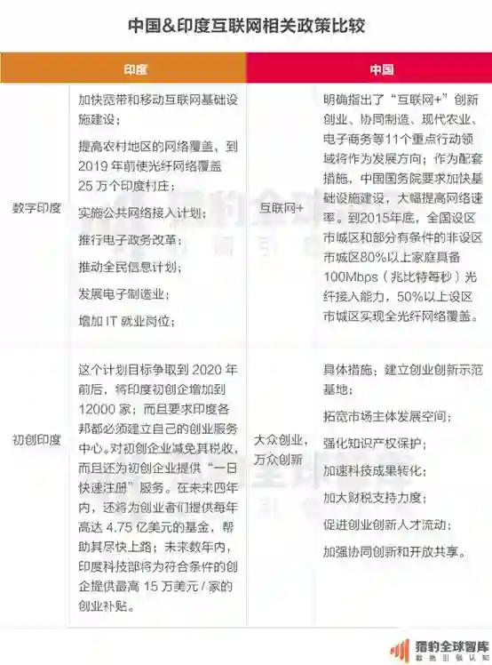 同为亚洲人口大国,中印都将互联网发展作为未来经济大战的重要组成部分,两国积极倡导创新与创业,中国提出了“互联网+”的概念,印度总理莫迪上台后则提出了“数字印度”等一系列倡议。