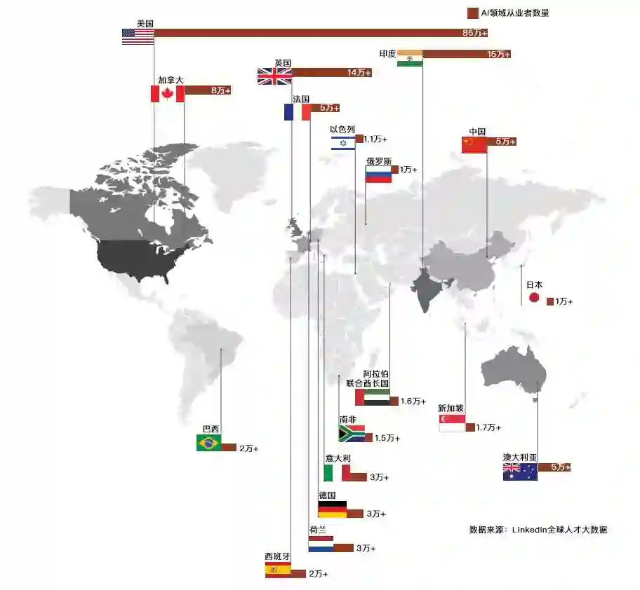 AI竞争中,人才储备是重要的一环。截止2017年一季度,领英全球AI领域人才报告数据显示,中国有超过五万的AI技术人才,为世界第七;印度具有超过15万的技术人才,位居世界第二;金砖国家的巴西、南非、俄罗斯这一数字分别超过2万、1.5万、1万。在这一数据上,人工智能产业发展较为缓慢的印度占据了有利数据。