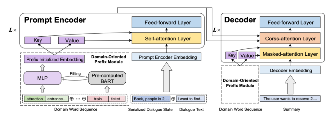 模型结构包括 Domain-Oriented Prefix,Prompt Encoder 以及 Decoder 三个部分。