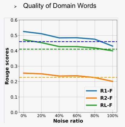探究领域词的质量的影响,将领域词的中的一定比例的词语以与领域无关的词汇替代。可以看到,随着更多的噪声被引入,模型受到更大的影响且表现下降。当噪声的比例超过 100% 时,模型的表现甚至比 Prefix- Tuning 糟糕。这是因为,我们使用完全无关的词汇去初始化 Prefix 模块,相比较随机初始化引入了更多的噪声影响了 DOP 的表现。从这一点看,引入高质量的领域词有利于领域解藕,高质量的领域词对摘要生成是重要的。