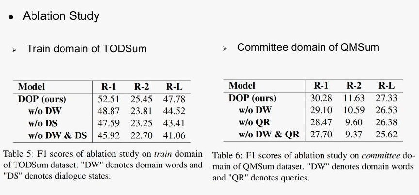 整体表现的趋势与在 TODSum 数据集上的表现一致,但是可以看出在 Rouges 的分数相对而言较低,是因为领域并没有明显的领域词,导致了严重的领域耦合的问题。除此之外,由于会议文本过长,很难从对话中捕捉核心内容。总的来说,这些结果表明多领域设置对于会议摘要是非常必要且有意义的。