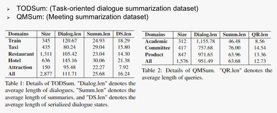 (TODSum 是我们提出的对话摘要数据集)和 QMSum 两个数据集上建立了实用且全面的 benchmarks.