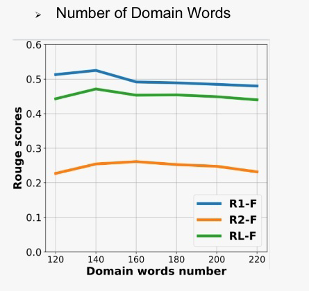 探究领域词数量的影响,可以看到领域词数量在 140 时使 rouge 达到了峰值,当低于 140 时,效果降低,说明参数量不足影响了模型的表现。当领域词数量超过阈值时,模型的表现下降,说明了太长的 prefix 序列给 BART 增加了负担,并且引入了额外的噪声。但是,领域词数量的变化并没有对模型的表现的有太大的影响(只有 2~3% 的起伏),说明了 domain-oriented prefix 模块和有效性和模型的鲁棒性。