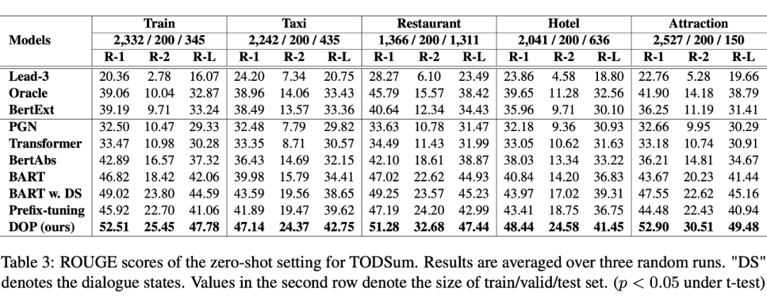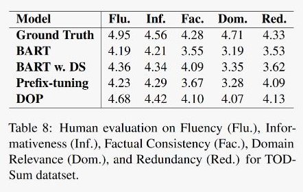 表中显示,所有模型的流畅程度都较高,说明在较强的 backbone 上微调的抽象摘要模型能够生成更流畅的句子。在事实一致性上,DOP 以及 BART ws DS 好于 Prefix-tuning 的表现,说明对话状态信息能引导模型更关注与核心的信息,例如槽值和意图。初次之外,DOP-tuning 在领域相关性上的表现超过了其他基线模型。说明了 domain-oriented 模块在提升模型识别领域相关特征以及从源域和目标域解藕出知识的能力。