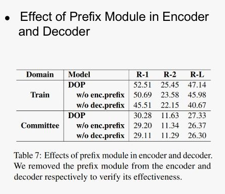 由于 DOP-method 在 encoder 和 decoder 中均引入了 prefix 模块,研究两个部分的 prefix 模块对模型表现的影响。可以看到,当两个部分的 prefix 被移除后,模型的表现均下降,说明了两个模块的 prefix 都是必要且高效的。
