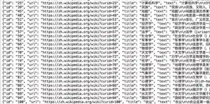 {"id":<id>,"url":<url>,"title":<title>,"text":<text>} 其中,title是词条的标题,text是正文;通过"\n\n"换行。