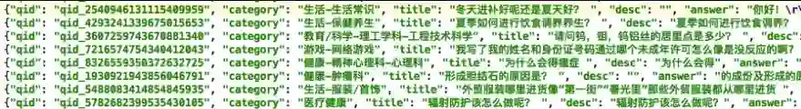 {"qid":<qid>,"category":<category>,"title":<title>,"desc":<desc>,"answer":<answer>}