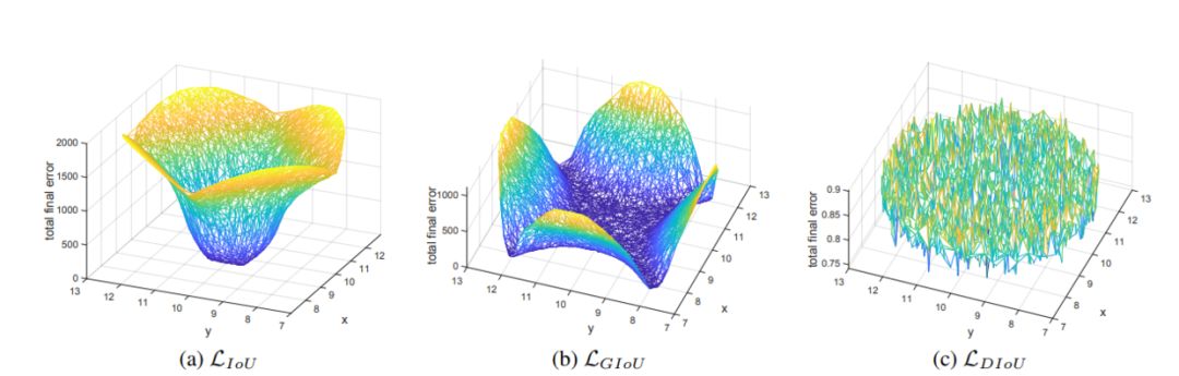 对于包含两个框在水平方向和垂直方向上这种情况,DIoU损失可以使回归非常快,而GIoU损失几乎退化为IoU损失。