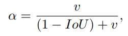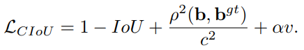 上述损失函数为CIoU的损失,通过公式可以很直观的看出,CIoU比DIoU多出了阿尔法和v这两个参数。