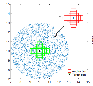 绿色框代表仿真实验需要回归的七个不同尺度的目标框,七个目标框的中心点坐标都是(10 * 10)。