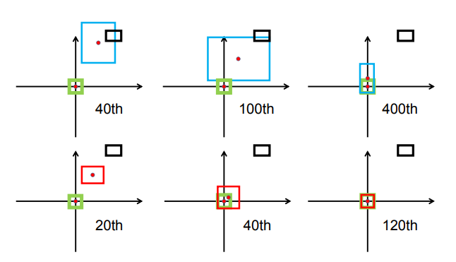 下图中第一行三张图展示的是GIoU的回归过程,其中绿色框为目标框,黑色框为anchor,蓝色框为不同次数的迭代后,anchor的偏移结果。