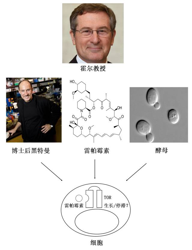 1989年,美国洛克菲勒大学的黑特曼(Joseph Heitman)成为霍尔第一位博士后,他与霍尔性格有些类似,也喜欢挑战自我,他试图理解生物感知周围环境,如温度和营养等变化并启动应答的机制。遗憾的是,黑特曼情况也很糟糕,一年多时间毫无进展,以至黑特曼开始怀疑人生,科研信心可说一落千丈。原来仅霍尔一个人郁闷,现在两人一起抑郁了,大家急需找到一颗救命稻草。此时,瑞士山德士制药公司(Sandoz,1996年合并为诺华公司)的饶·默瓦(Rao Movva)找到了他们。