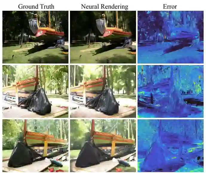 图11:在罗马船只数据集上合成的新视图。使用与参考照片相同的曝光值对图像进行渲染。在右列中,每个像素的误差都是可视化的