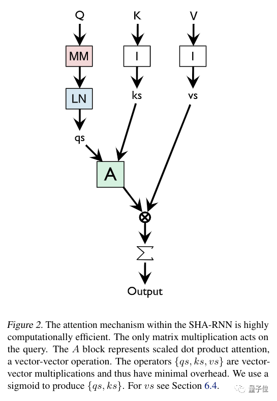 相比之下,SHA-RNN模型的注意力是简化的,只留一个头,唯一的矩阵乘法出现在query (下图Q) 那里,A是缩放点乘注意力 (Scaled Dot-Product Attention) ,是向量之间的运算。