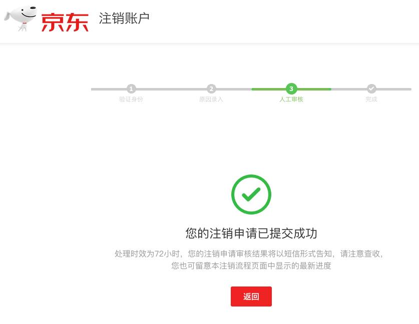同意《京东账户注销须知》后,便会进入手机验证身份、注销原因录入的环节。全部填写完毕后,页面将显示注销申请已提交人工审核,处理时效为72小时,处理结果将以短信告知用户。