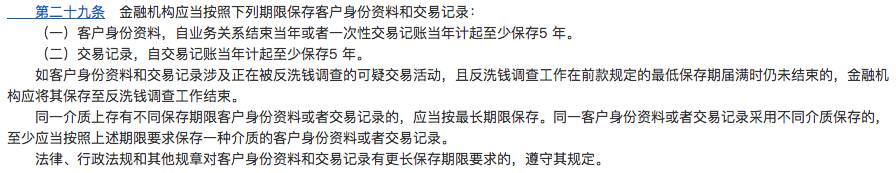 中企哥查询有关规定得知,根据《金融机构客户身份识别和客户身份资料及交易记录保存管理办法》第二十九条,客户身份资料,自业务关系结束当年或者一次性交易记账当年计起至少保存5年;交易记录,自交易记账当年计起至少保存5年;如客户身份资料和交易记录涉及正在被反洗钱调查的可疑交易活动,且反洗钱调查工作在前款规定的最低保存期届满时仍未结束的,金融机构应将其保存至反洗钱调查工作结束。