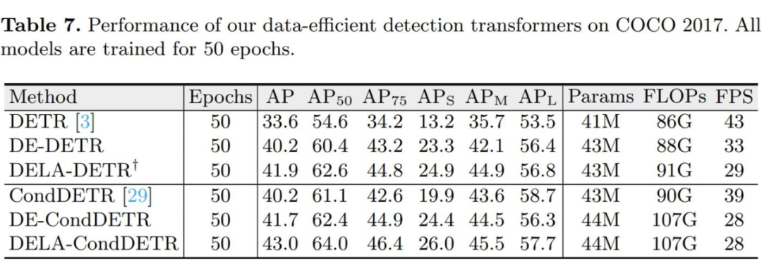 尽管以上实验说明了我们的方法能够在数据量有限的情况下显著提升模型性能,它并不能表明我们的方法在数据量充足时依然有效。为此,我们在数据量充足的 COCO2017 上测试我们方法的性能。有趣的是,我们的方法不仅不会降低模型在 COCO 2017 上的性能,还能带来不小的提升。具体来说,DELA-DETR 和 DELA-CondDETR 分别相较于它们的 baseline 提升 8.1A P和 2.8AP。