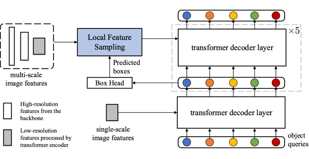 的存在,每一层解码器层中都为我们提供了物体检测框的信息。因此,我们可以在不引入新的参数的情况下,借助这些物体定位框来做局部特征采样。尽管可以采用更成熟的特征采用方法,我们采用最常用的 RoI Align。从第二层解码器层开始,我们借助前一层解码器的输出来做稀疏特征采样。