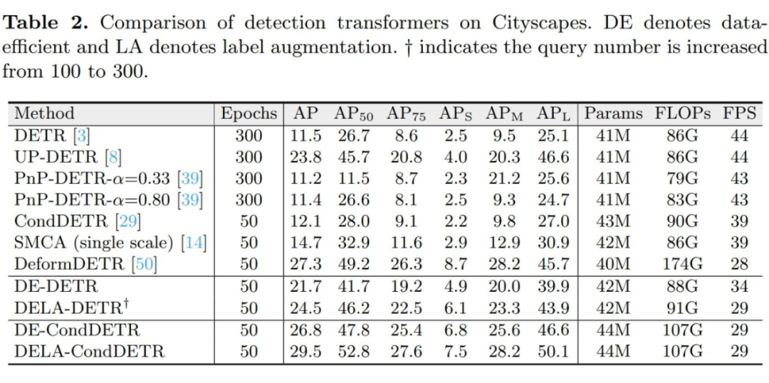 (约 3k 训练图像)上,尽管 Faster RCNN 能够稳定的取得优良的性能,大多数 Detection Transformers 的性能显著下降。并且尽管不同 Detection Transformers 在 COCO 数据集上性能差异不到 2AP,它们在小数据集 Cityscapes 上的性能有大于 15AP 的显著差异。