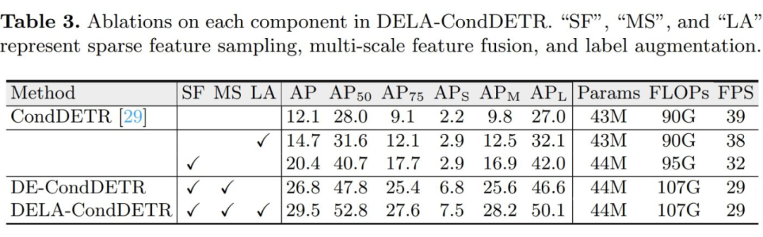 我们首先消融我们方法中各个模块的作用,如表 3 所示。 使用局部特征采样和多尺度特征均能够显著提升模型的性能,分别带来 8.3 AP和 6.4 AP 的提升。此外,使用标签增强能够进一步带来 2.7 AP 的性能提升。并且单独使用标签增强也能够带来 2.6 的性能提升。