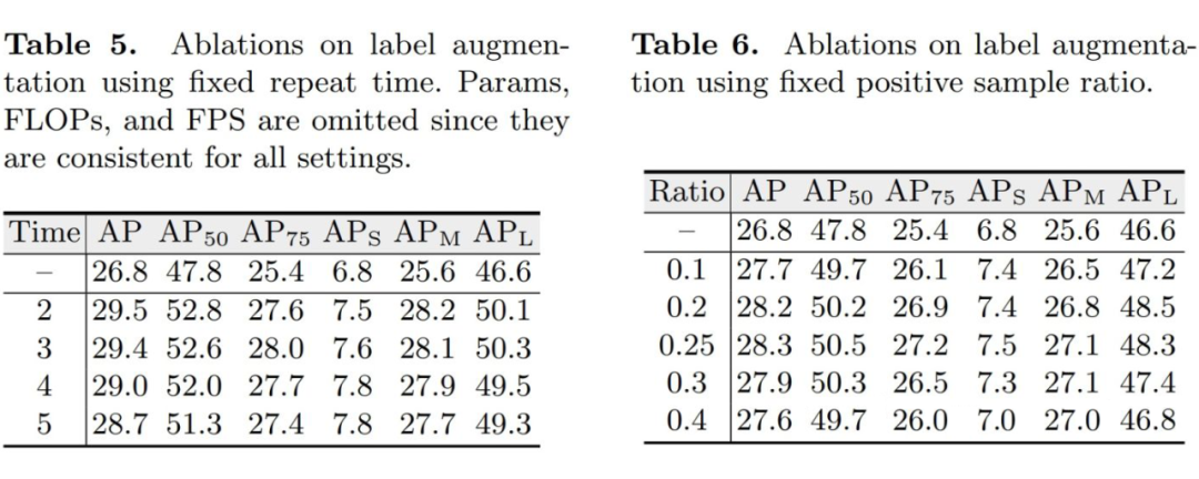 如方法部分中讨论的,我们考虑了两种标签增强策略。包括固定重复次数和固定正负样本比例。在本部分,我们对这两种策略进行消融。如上表中左表所示,使用不同的固定重复倍数均能够提升 DE-DETR 的性能,但随重复次数增加,性能提升呈下降趋势。我们默认采用重复正样本标签 2 次。