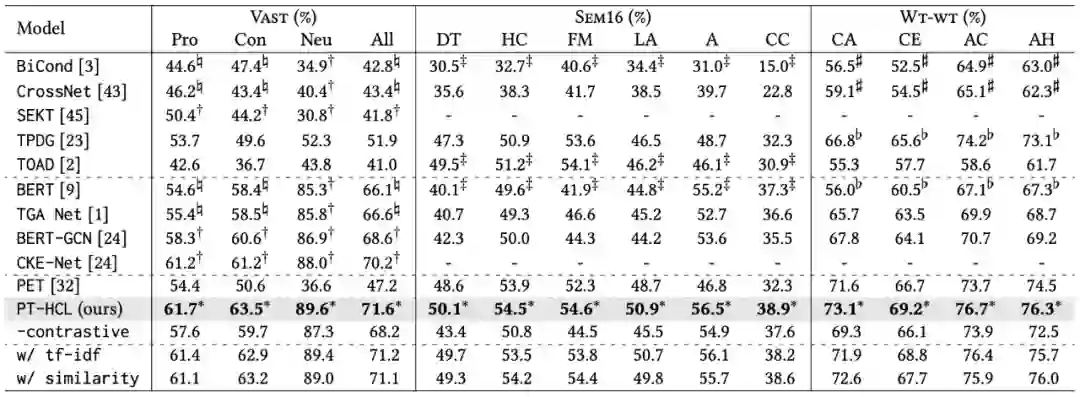我们在 3 个公开的零样本立场检测数据集(VAST、SEM16 和 WT-WT)中进行对比实验。实验结果显示我们提出的 PT-HCL 方法在所有零样本立场检测数据集中的各项性能指标都达到了最优。