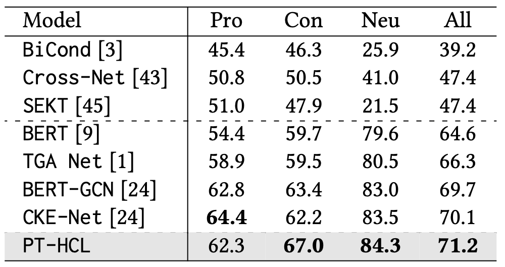 随后通过结合代理任务和原本的 label 信息,我们提出了一种基于代理任务的分层对比学习框架(PT-HCL),能使模型在区分出目标无关与相关的基础上区分样本的立场特征表示。最终在三个常用的公开数据集上的结果表明,我们提出的框架取得了目前最佳的性能。