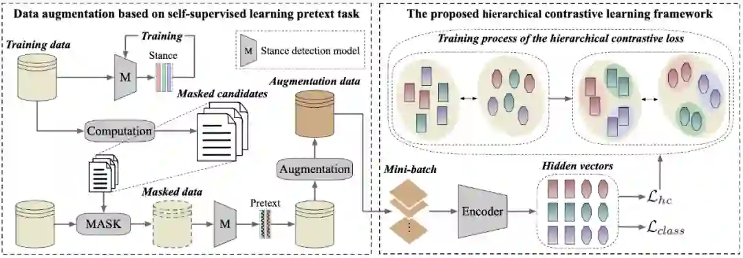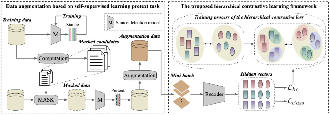 ▲ 图1:基于代理任务的分层对比学习框架图。渐变色图形代表隐藏向量,不同类型的图形代表不同的立场类型,不同颜色的图形代表不同的立场类别。