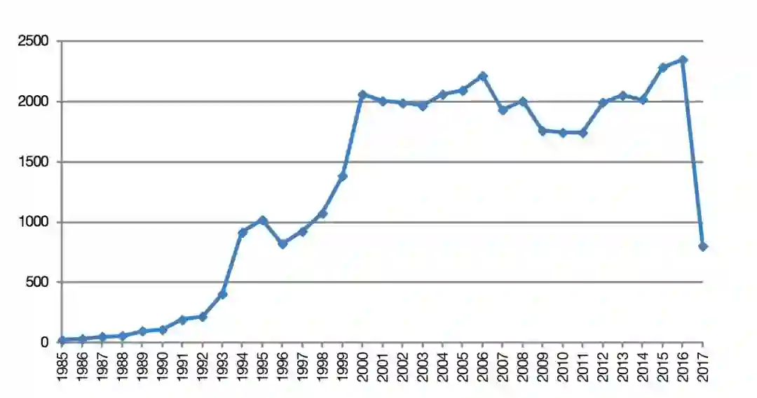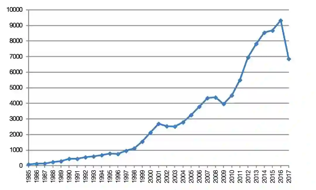 与此同时,美国、日本和欧洲地区的申请量虽然整体处于上升态势,但在2016年前后,申请量有所回落。这三个国家和地区近两年的增长速度稍微放缓,2017年的申请量下降可能是由于部分2017年的专利申请未公开的情况造成。但对于欧洲地区和日本,2017年的申请量整体下降的趋势似乎已经难以逆转。