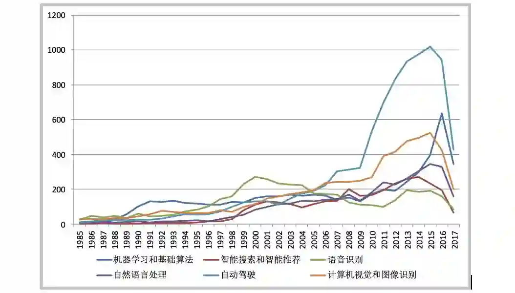 机器学习和基础算法、自然语言处理、计算机视觉和图像识别、语音识别、智能搜索和智能推荐、自动驾驶整体呈上升趋势,其中机器学习和基础算法、计算机视觉和图像识别从20世纪90年代初开始加快发展速度,进入20世纪90年代中期后自然语言处理、智能搜索和智能推荐、自动驾驶也加快了发展速度,达到了一个小高峰,之后曲折式上升,但在2014年以后计算机视觉和图像识别、智能搜索和智能推荐发展速度有所下降,机器学习和基础算法、自然语言处理反而在2014年以后迅速发展,语音识别这一发展路线不同于其他5个发展路线,在进入20世纪90年代中期后迅速发展,在2000年前后达到峰值,但之后一直呈下降趋势,机器学习和基础算法、自然语言处理、自动驾驶在2017年的申请量下降可能是由于部分2017年的申请未公开的原因。