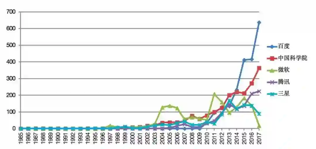 首先来看下中国,在CNABS数据库中,课题组对人工智能领域主要申请人的申请量进行统计,得到申请量排名前五的申请人依次为百度(2368件)、中国科学院(2036件)、微软(1648件)、腾讯(1168件)和三星(1047件)。这几位申请人的申请量年度变化趋势如下图所示。