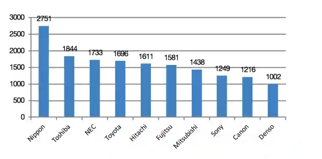 例如,日本企业东芝在美国的AI专利申请数量为831件,在日本则达到了1844件。在日本人工智能申请量排名靠前的各个公司全为日本本国公司,上述几家公司的主要申请都在日本,可以看出,诸如IBM、Google等美国公司在日本的专利布局量并不多。