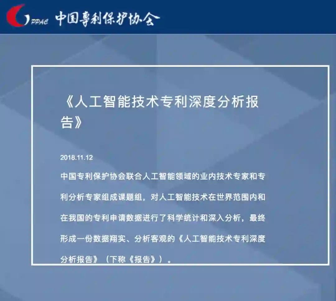 11月12日,中国专利保护协会发布《人工智能技术专利深度分析报告》,对人工智能技术在世界范围内和在我国的专利申请数据进行了科学统计和深入分析。