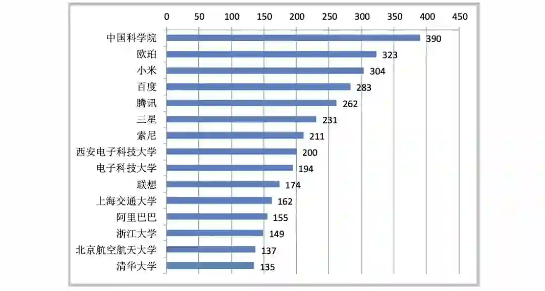 与机器学习和基础算法形成鲜明的对照,在智能搜索和智能推荐方向,专利申请的主力是大型互联网企业及智能终端厂商。国外申请人有四位上榜,分别是微软、三星、谷歌和LG。在国内申请人中,百度的申请量以576件遥遥领先,腾讯以220件位列国内申请人的第二位。在科研机构中,中国科学院和浙江大学排进了前15位,但申请量并不是很大。