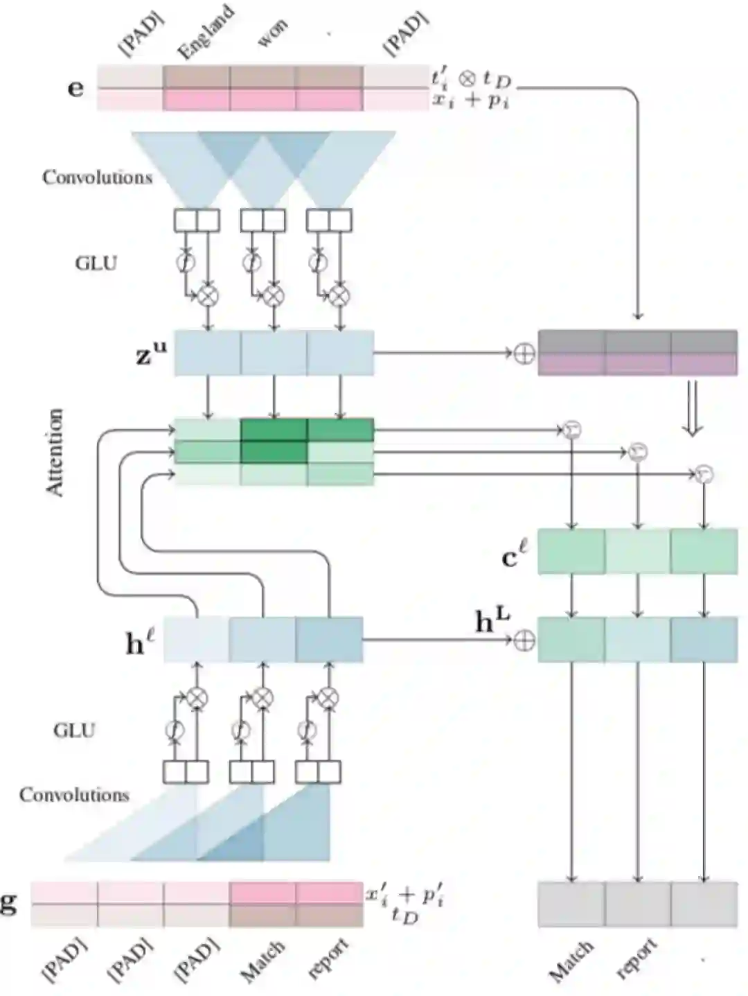 2017年有两篇基于机器翻译任务的工作摆脱了RNN结构,采用了CNN和Transformer,一定程度上证明了非RNN结构在NLP任务上的可行性。Facebook的这篇Convolutional Sequence to Sequence Learning提出了基于Attention-Seq2seq框架的Convs2s结构,用CNN做编解码单元,通过学习位置向量弥补CNN不具备的序列特征捕捉特性,并借助残差结构,GLU等技巧让网络可以堆叠的足够深,从而让CNN也能捕捉长距离文本特征,另外CNN的并行能力远超RNN,因此该结构理论上似乎可以更节省时间,本节将介绍两篇基于Convs2s结构的工作,第一篇融合了主题模型作为额外的特征,第二篇结合了强化学习的方式,两者虽基于Convs2s结构,但对其他结构同样有启发性。