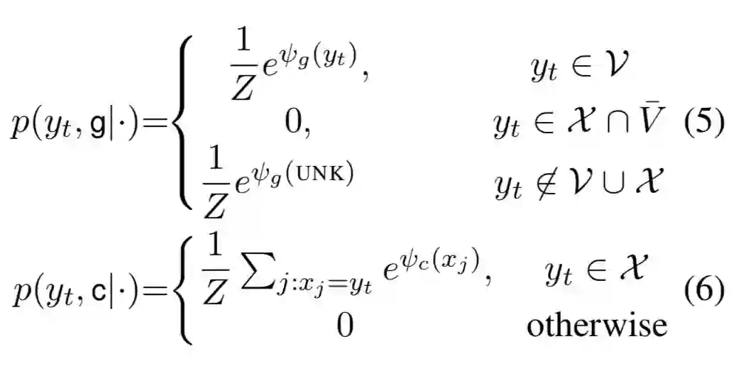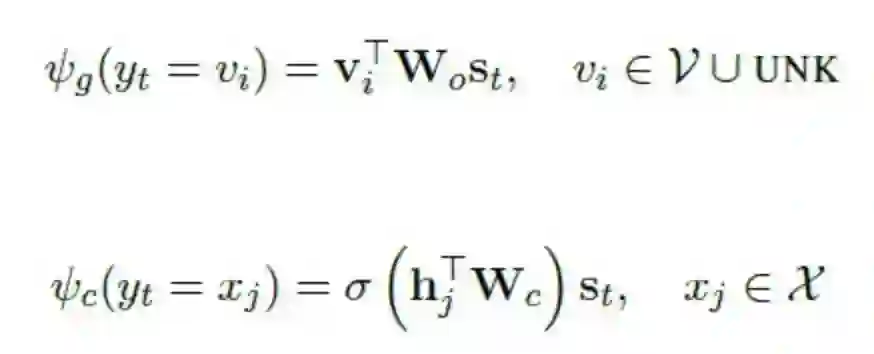 V就是传统seq2seq的词汇表,X在这里是用于预测copy词的词典,可以看到无论P_c还是P_g,和传统seq2seq的形式都是一样的。区别在于词典,X上针对输入文本构造的,因此其中可能包含V中没有的词,所以copy-net解决上面提到的OOV问题的关键就是用这个词典预测copy词。