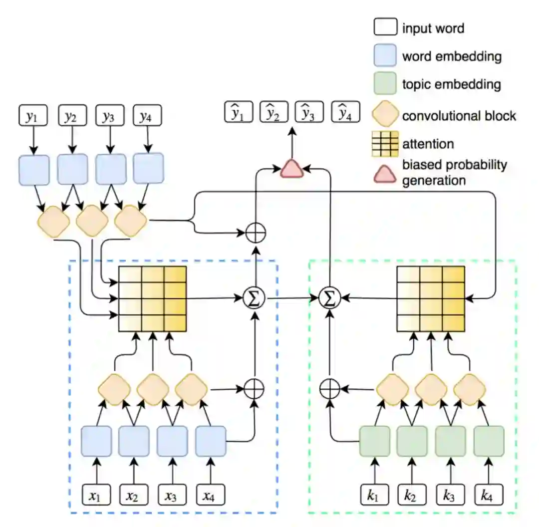 由上图可以看出,本文的主题信息不再和输入文本的embedding求和,而是先单独通过卷积编码,再和decoder的输入部分共同参与attention计算,通过两边的attention相加来融合文本embedding和主题信息;此外,还有一个概率生成模块(biased probability generation)负责进一步控制融合。