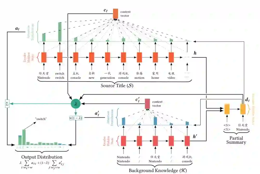 从上图的结构中可以看到,文中提出的MS-Pointer结构有两个输入,商品标题作为传统Encoder输入,背景知识作为额外的输入文本,两种输入的处理方式相同,encoding后与Decoder的输入分别计算出两个attention,然后按照pointer-generator的思路结合两种分布,只不过这里结合的是传统词表的概率分布与背景知识特征的概率分布。