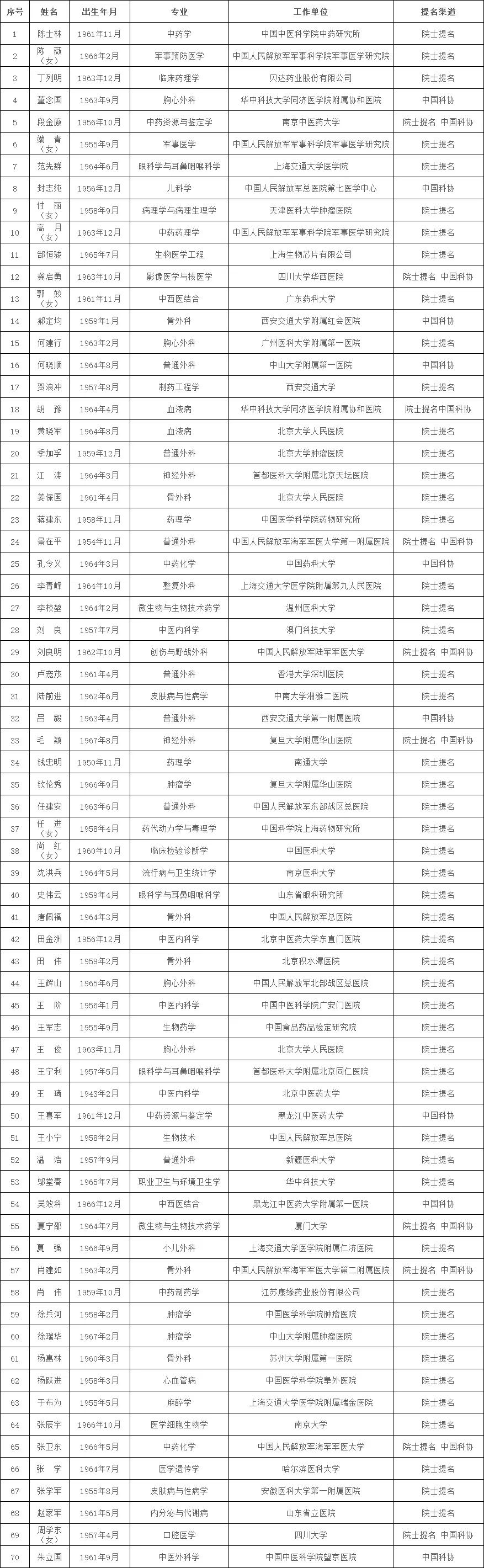 在这70人中,由院士与中国科协共同提名为10人,由中国科协单独提名的为9名,由院士单独提名的为51名。